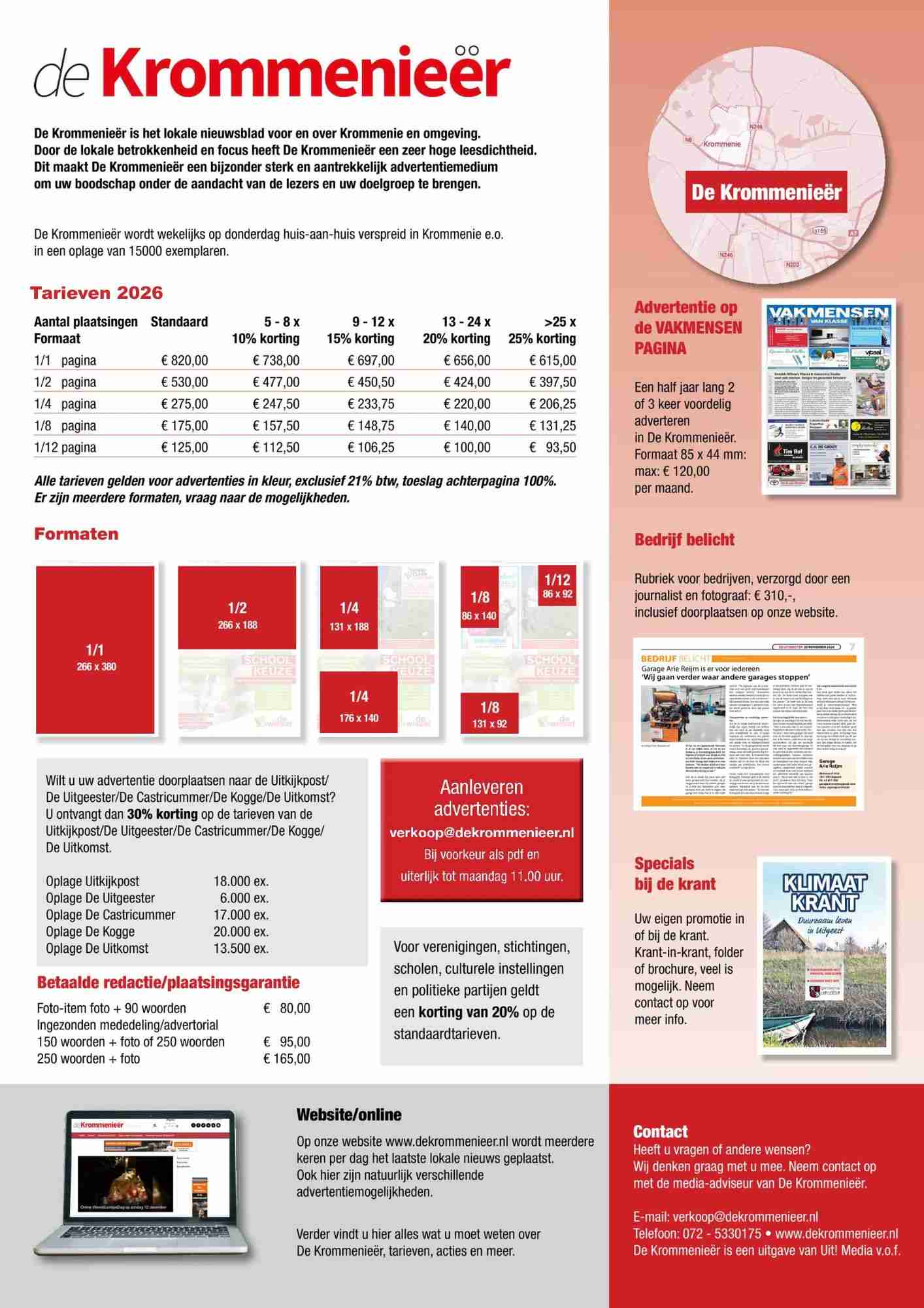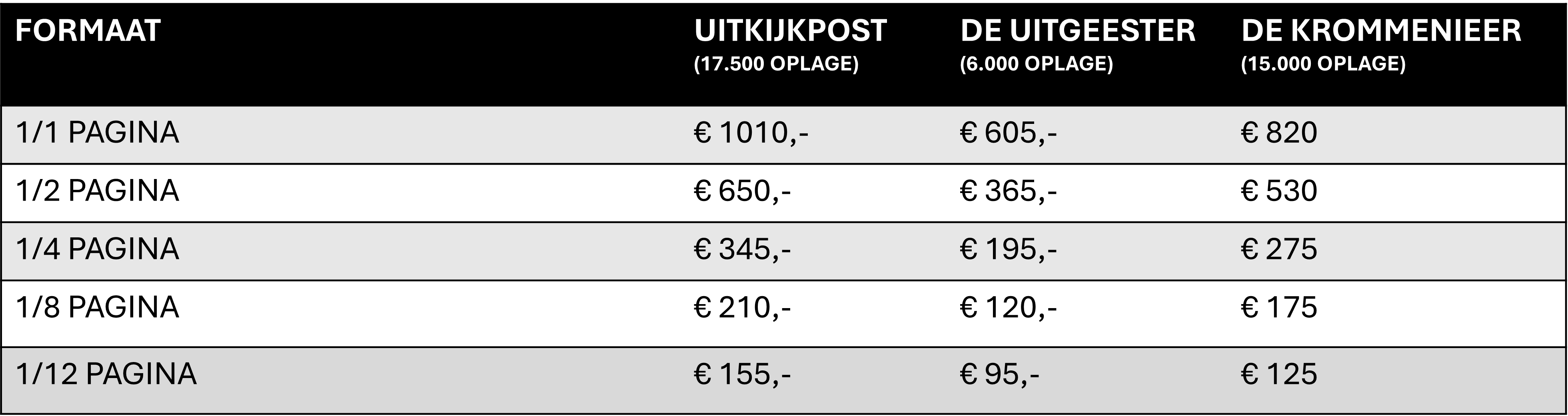 Uitkijkpost Media heeft een nauwe samenwerking met De Castriucmmer, De Uitkomst (Graft- de Rijp) en De Kogge (Koggeland), en hanteert gunstige tarieven voor het (door) plaatsen van advertenties naar deze titels. Voor meer informatie neem contact op met onze verkoopafdeling ( verkoop@uitkijkpost.nl of verkoop@uitgeester.nl)