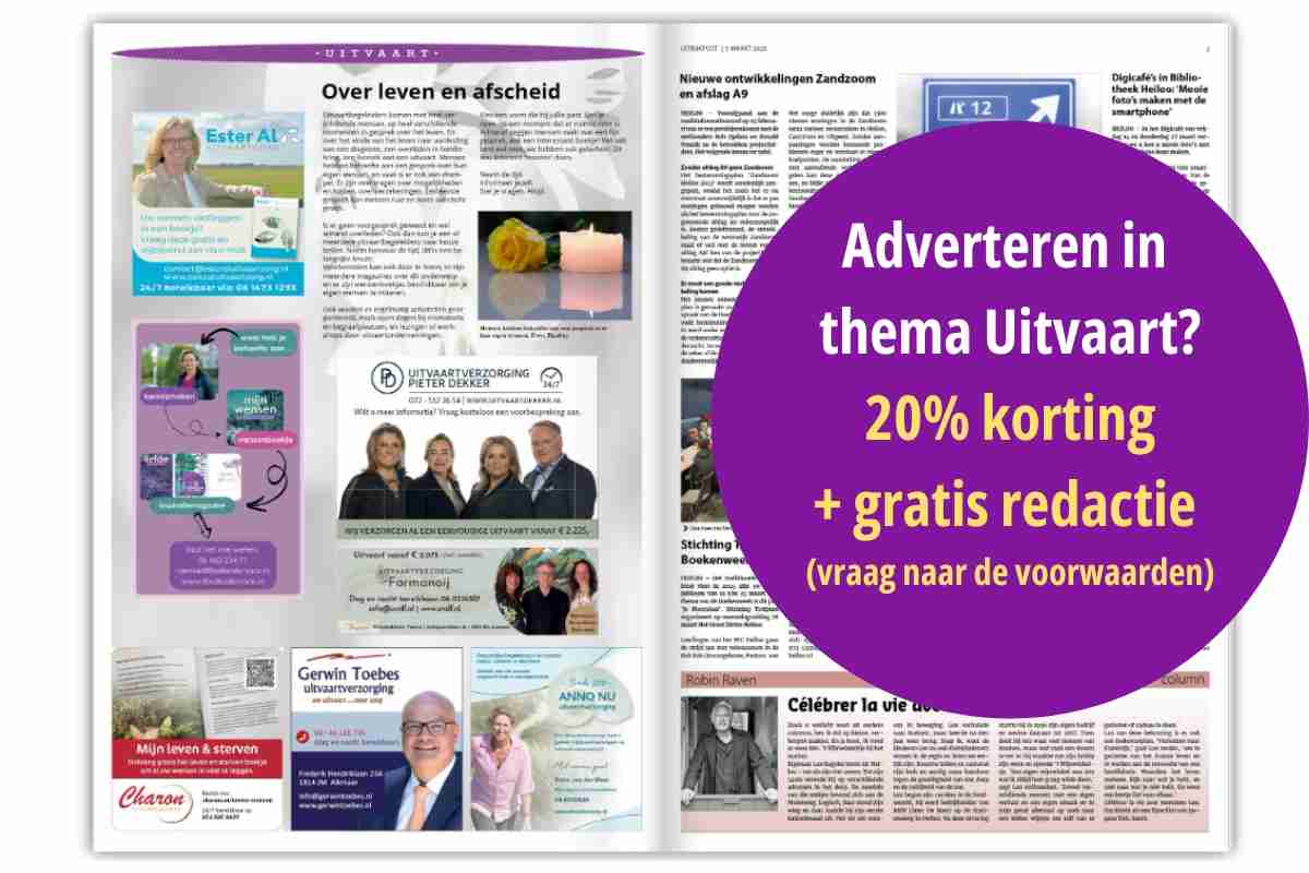 Profiteer nu van de thema-actie: 20% korting op alle formaten + gratis redactie (bij het formaat halve pagina advertentie). Door te adverteren bereikt u niet alleen nabestaanden, maar ook professionals in de branche.